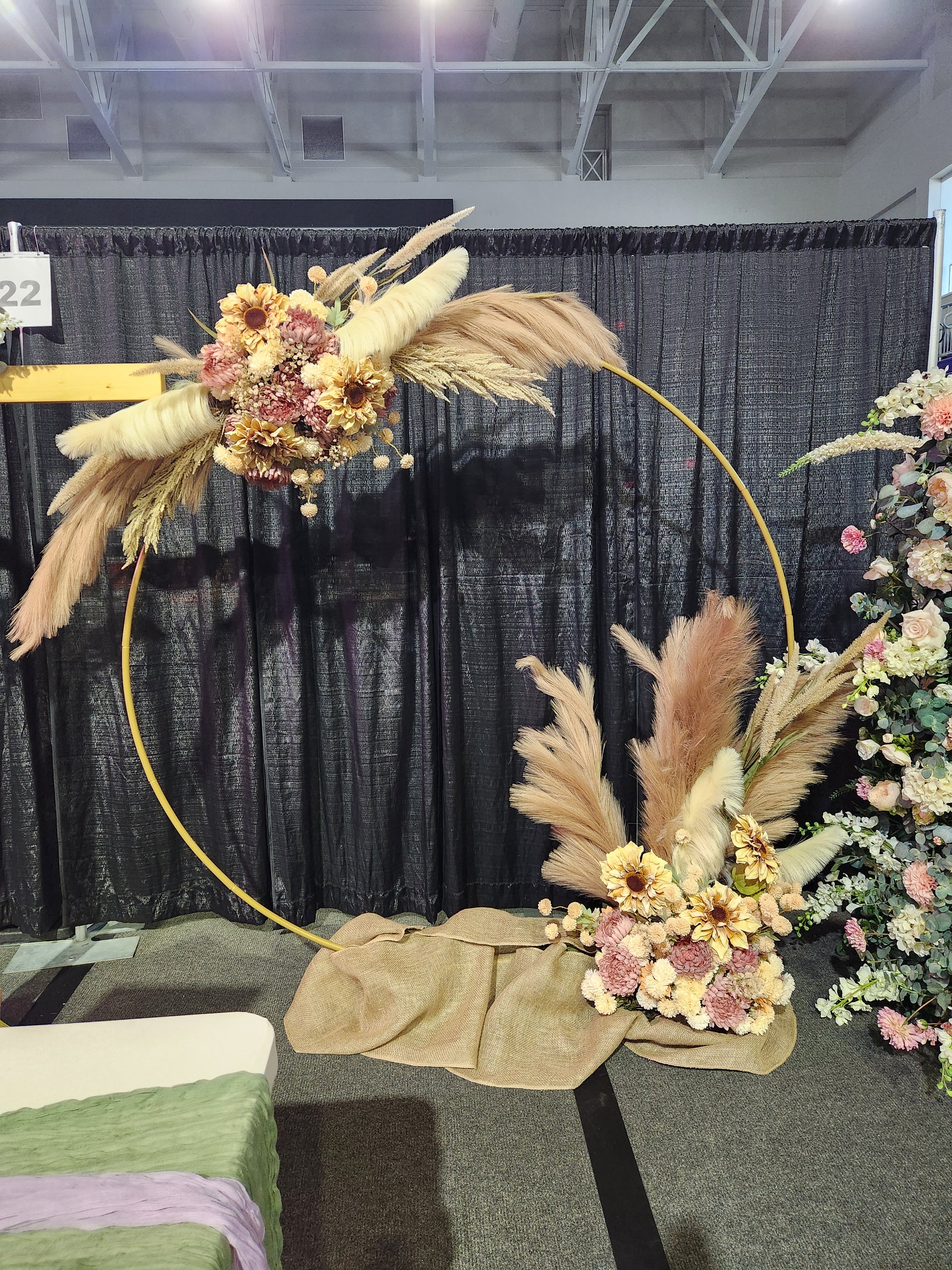 Warm, romantic, and effortlessly bohemian — this fall-inspired circle arch captures the beauty of the season in full bloom. Handcrafted with soft pampas grass, dried grasses, and faux florals in shades of honey, blush, and mauve, it creates a dreamy backdrop that feels both elegant and organic.